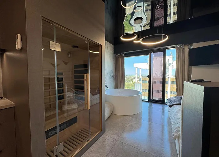 Panorama Level 25 & 26 S P A Z Wanna I Saunaアパートには設備の整った台所が備わっています。 Katowice Sadowaバス停はこのアパートほんの数分の場所にあります。